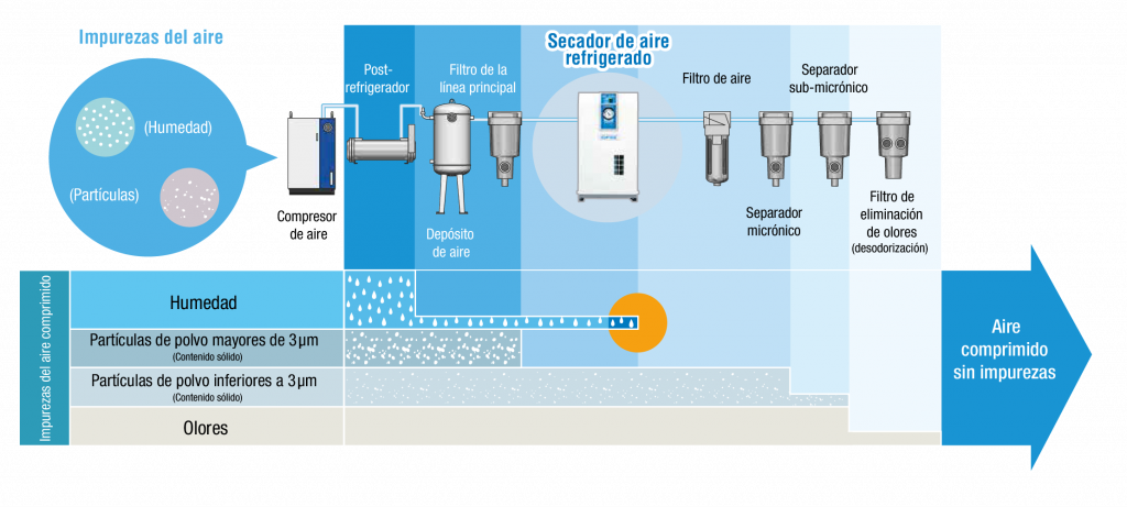 El aire comprimido incluye objetos extraños como la humedad (vapor de agua, gotitas de agua), aceite y partículas. Las gotitas de agua, el aceite y las partículas pueden eliminarse usando filtros de aire, separadores micrónicos, etc., pero la humedad debe eliminarse mediante un secador.